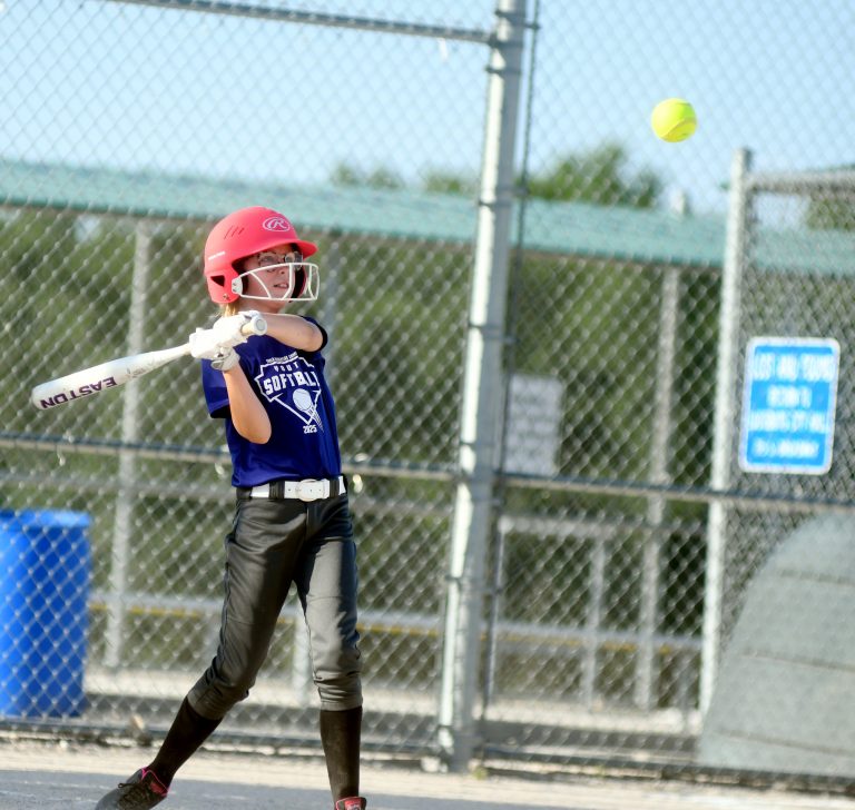 Presley Mills, sporting her pink helmet, prepares to take a big swing at a pitch for the Paola Purple Dragons.Gene Morris / Miami County Republic
