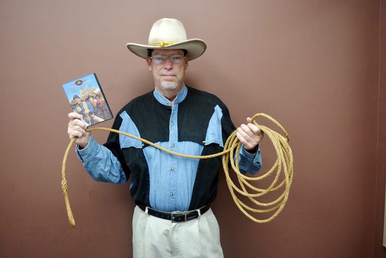 Sports editor Gene Morris shows off some of his cowboy Western wear after helping get a calf back in the pasture in Parker made him think of Billy Crystal and a calf named Norman from the movie “City Slickers.”Brian McCauley / Miami County Republic