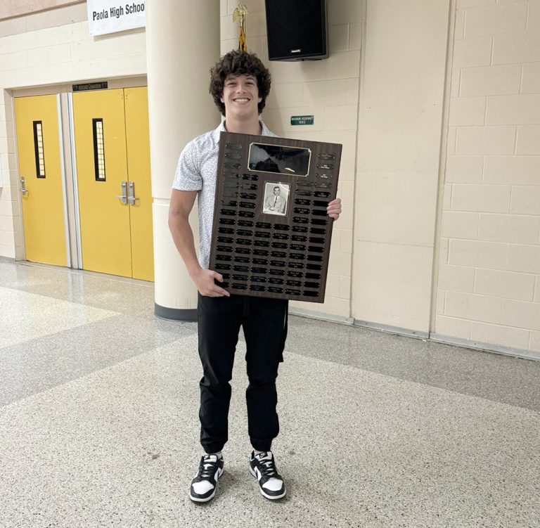 Paola senior JJ Crawford poses for pictures with the V.J. Elson Award presented to an outstanding senior on the Panther football team.Submitted Photo