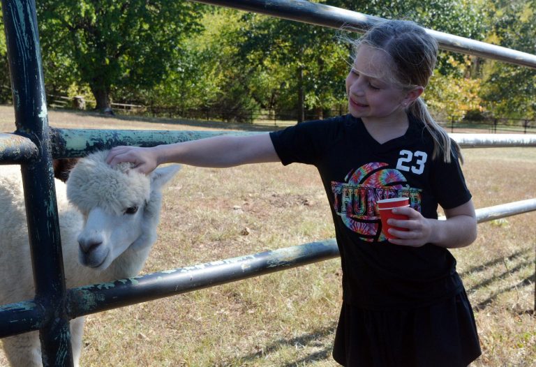 Vivian Motycka of Leawood pets an alpaca at Timber View Farm Alpacas during last year’s Miami County Fall Farm Tour.Brian McCauley / Miami County Republic