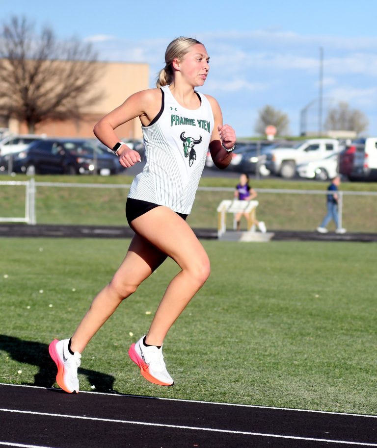 Bree Allen of Prairie View gets out to a strong pace in the 1,600-meter run. Allen ran a Pioneer League record time to win the event at Prairie View on Thursday, May 15. File Photo