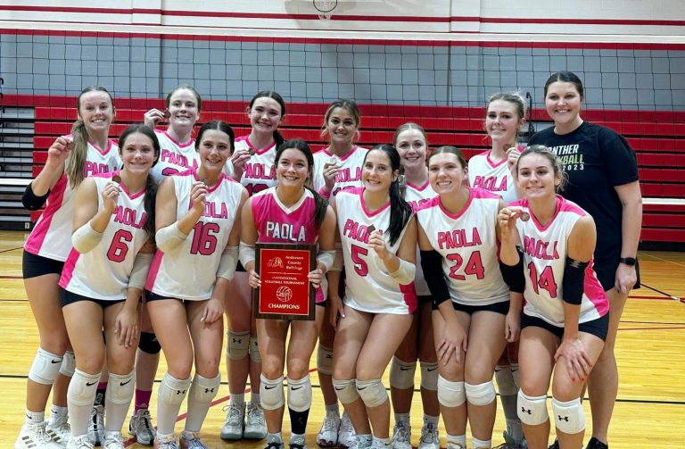 The Paola Lady Panthers volleyball team was undefeated in the Anderson County Invitational, placing first in the standings. Pictured with the team trophy are (in front, from left) Berkley Meinig, Kinzley Meinig, Caylee Crawford, Brailee Wicker, Ruby Kane and Vanessa Haas; (back row) Amanda Pitzer, Elsie Blackmore, Charley Stanchfield, Lilli Shay, Kamryn Winterscheid, Ellie Trachsel and coach Marie Palmer.Submitted Photo