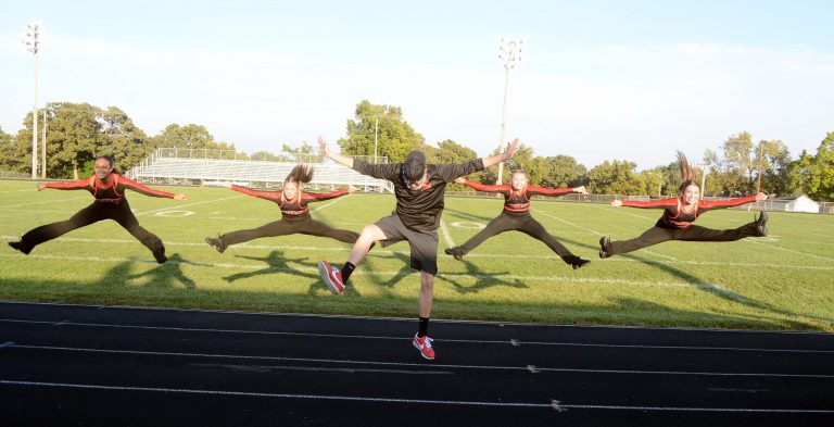 Osawatomie flag football coach Dave Stephens does a kick as the Dazzlers practice their toe-touch prior to performing during the homecoming community pep rally at Lynn Dickey Field on Wednesday, Sept. 24. Dancing with Stephens are (from left) Amaya Marta, Rayona Nash, Angel Brown and Avaya O’Brien.Gene Morris / Miami County Republic