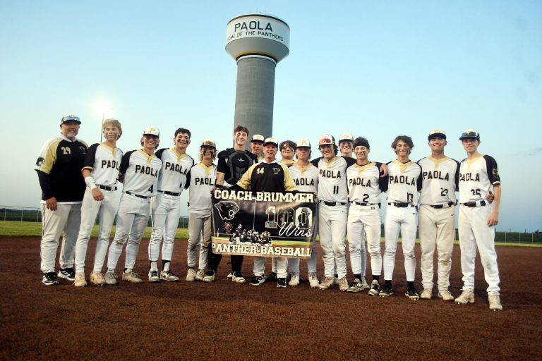 The Paola baseball team poses for pictures with a banner commemorating coach Tony Brummer’s 100th win with the Panthers following a doubleheader sweep against the Ottawa Cyclones to wrap up the Frontier League title on senior night Thursday, May 8.Gene Morris / Miami County Republic