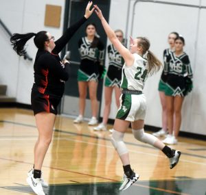 Louisburg guard Myles Vohs (right) battles Spring Hill’s Brooks Bayer and Ryan Jackson for a rebound.Gene Morris / Miami County Republic