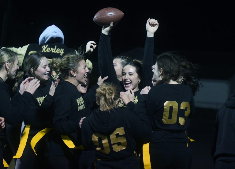 Brylynn Wicker holds up the football and celebrates in the end zone after catching the game-winning touchdown pass to lead the Paola seniors to a 14-8 victory against the juniors during the annual Powder Puff game.Gene Morris / Miami County Republic