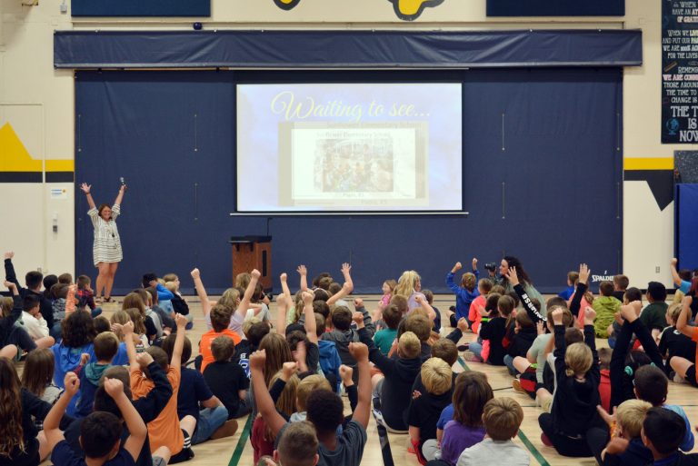 Sunflower Elementary principal Staci Wokutch and students celebrate after the announcement is made that the school has been named a National Blue Ribbon School.Brian McCauley / Miami County Republic