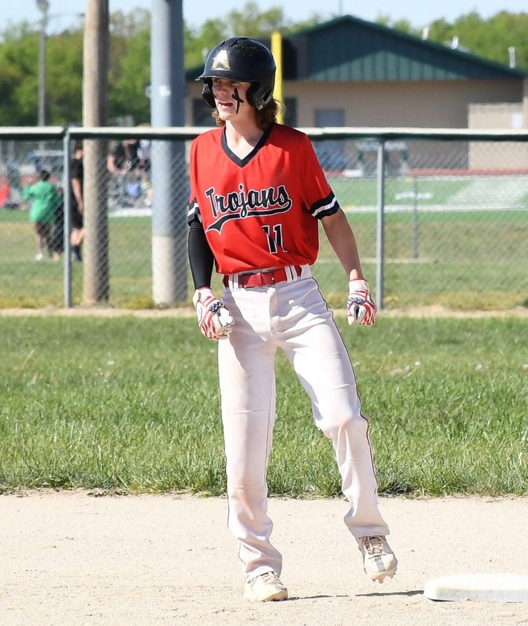 Troy Mosley stands on second base after a base hit for the Osawatomie Trojans. He pitched a one-hitter in the second game of a doubleheader sweep against Jayhawk-Linn on Friday, March 28.Submitted Photo